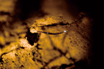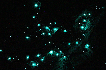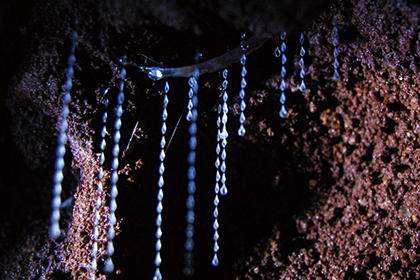 The glow worms create a galaxy of light from their homes on the cave roof to attract prey. Each larvae hangs a sticky mucus thread to capture its prey and reel them in towards their tiny mouth.